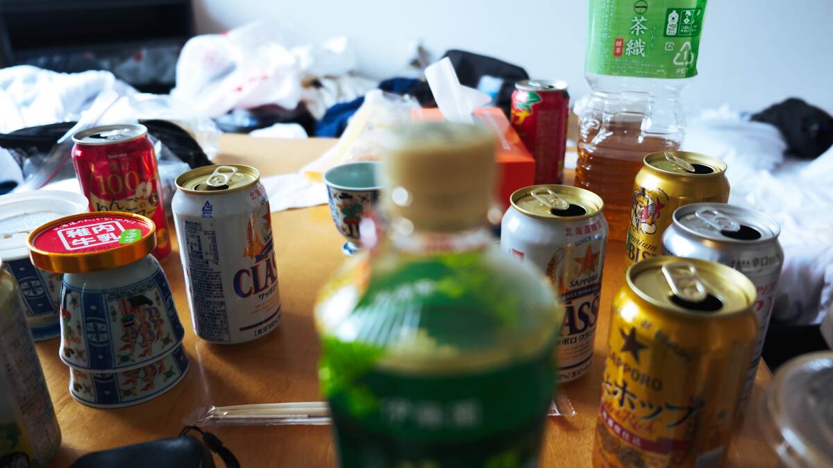 お酒の缶やらアイスの蓋やらで散らかった机。