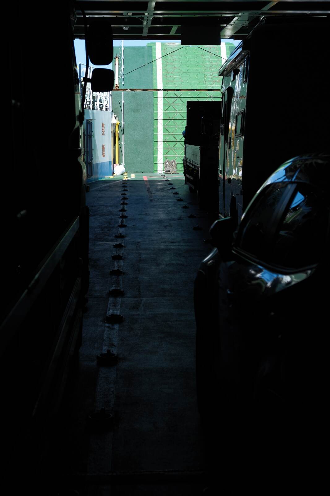 ターミナルで乗船手続きを済ませ、車を船に積み込む。
